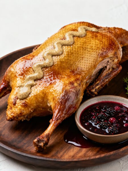 Rata la cuptor cu piure cu trufe si sos de fructe de padure, vin